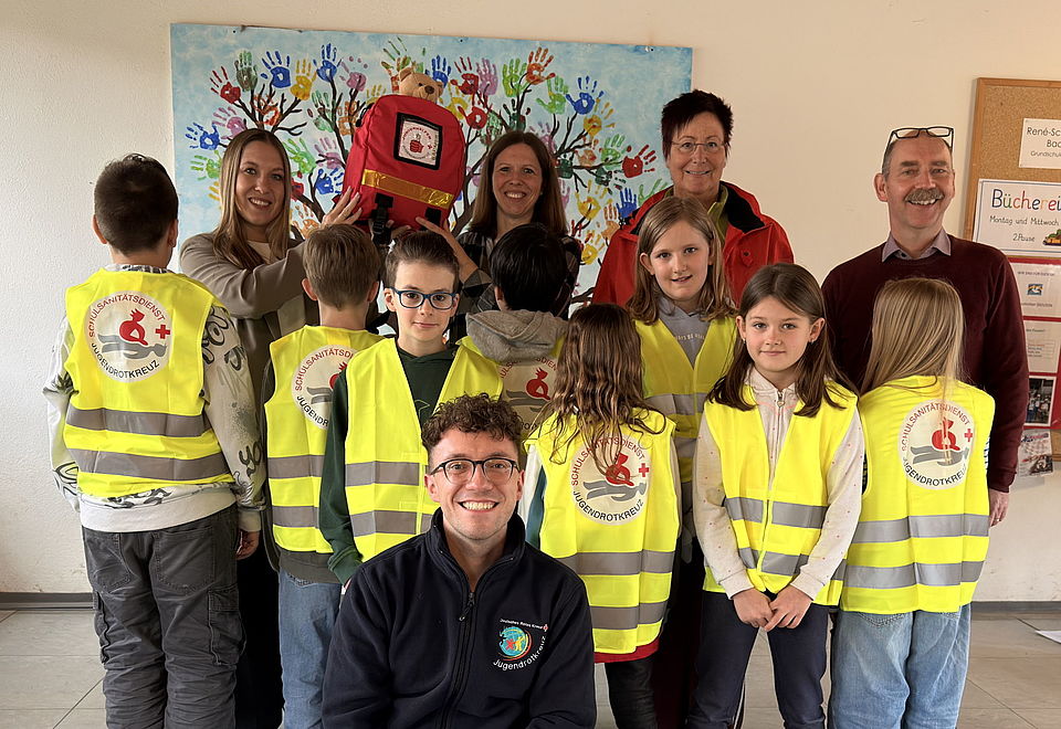 Insgesamt sind an der René-Schickele-Grundschule in Badenweiler 10 Mädchen und Jungen der dritten und vierten Klasse zu Juniorhelfern ausgebildet worden. Das nötige Know-how für diese verantwortungsvolle Arbeit erhielt die Betreuungslehrerin Sandra Koch bei einer Juniorhelfer-Lehrkräfte-Qualifikation des Deutschen Roten Kreuzes. “Mit diesem Wissen sind die Juniorhelfer bestens darauf vorbereitet, in den Pausen auf dem Schulhof bei kleineren Verletzungen Erste Hilfe zu leisten.“ freut sich Sandra Koch. Die BARMER finanziert die Juniorrucksäcke, die jede teilnehmende Schule erhält. Darin befindet sich alles Notwendige für die Erste Hilfe: z.B. Verbandszeug und eine Rettungsdecke und sogar ein Tröste-Bär. Gemeinsam übergaben Miriam Weber von der BARMER in Bad Krozingen, Daniela Kirschner und Angelo Galletto vom DRK Kreisverband Müllheim e.V., das ,,Starter Kit‘‘ an die Juniorhelfer-Gruppe der René-Schickele-Grundschule.
